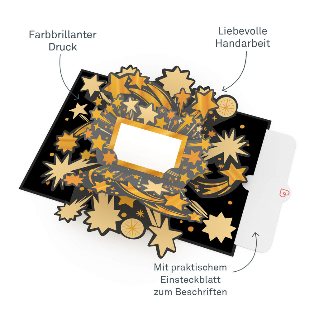 Nous avons papier écrasé lancé pour créer des cartes de vœux qui créent des moments inoubliables et ravissent vraiment tout le monde. Notre passion va dans la conception de structures pop-up complexes et dans les illustrations affectueuses de nos cartes 3D. Et pour que le destinataire puisse profiter encore et encore de nos cartes, nous utilisons du papier durable de haute qualité et misons sur un travail manuel précis et des découpes délicates pour obtenir une carte pliée parfaite.